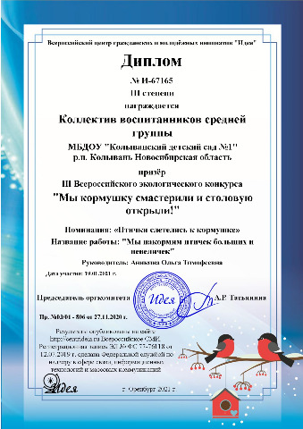 III Всероссийский экологический конкурс «Мы кормушку смастерили и столовую открыли!» номинация "Птички слетелись к кормушке"